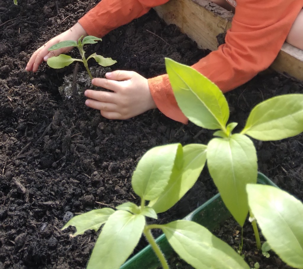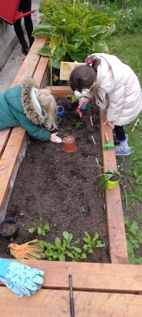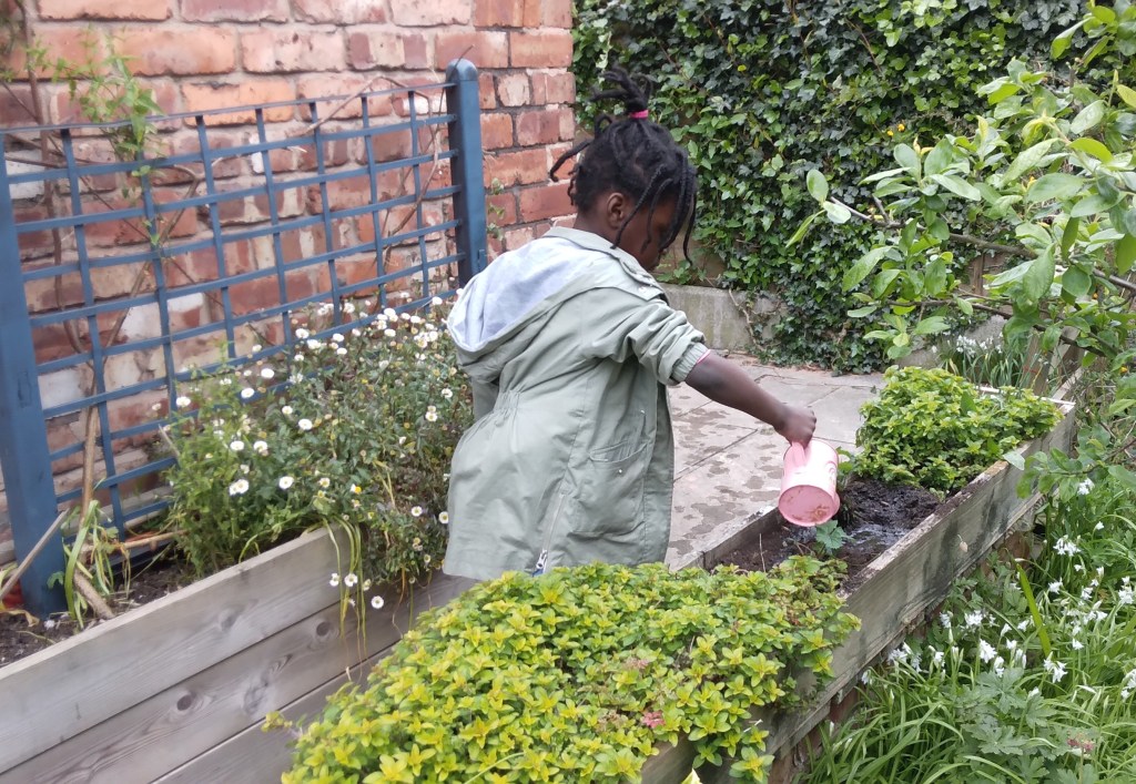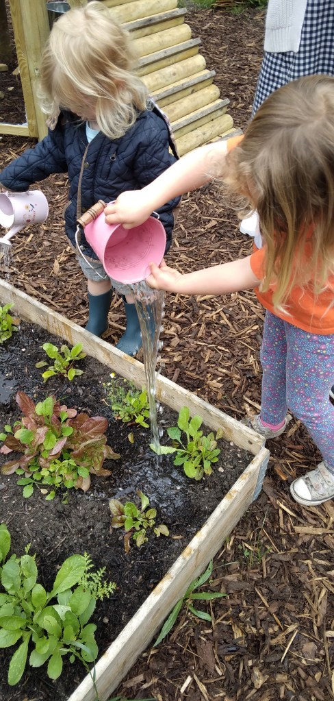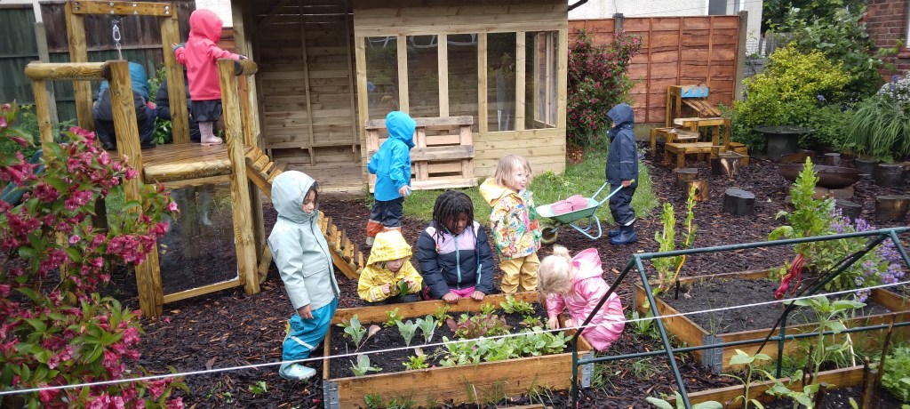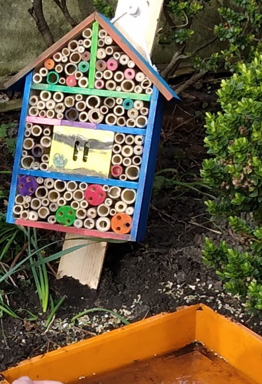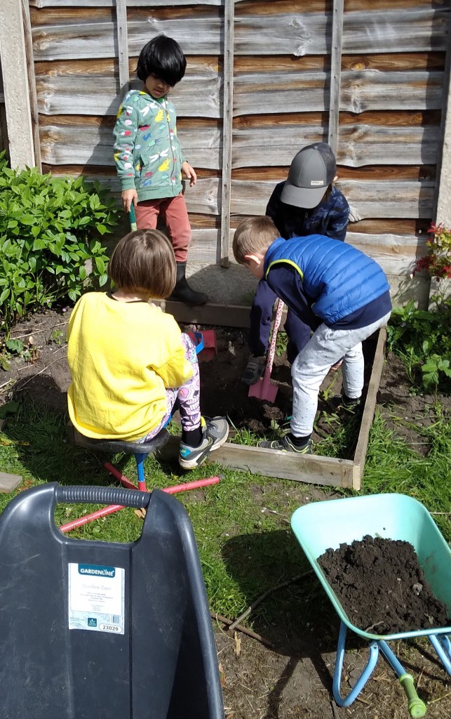 We at MMH redesigned our garden area with the input of the children. Providing space for plants (our nature and wildlife area, to that a pond and bug hotel which the children have designed and made. Observing on daily basis with great interest. We have made 4 planters to grow flowers, herbs and fresh vegetables and care for daily.