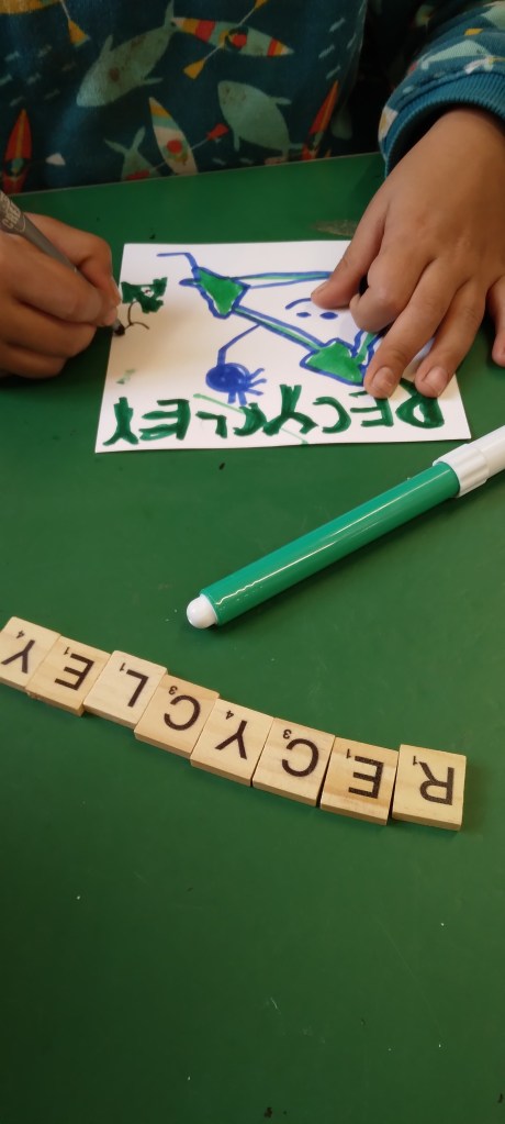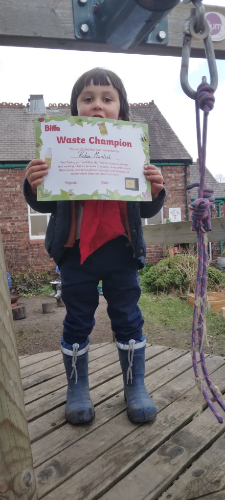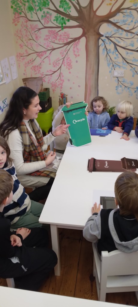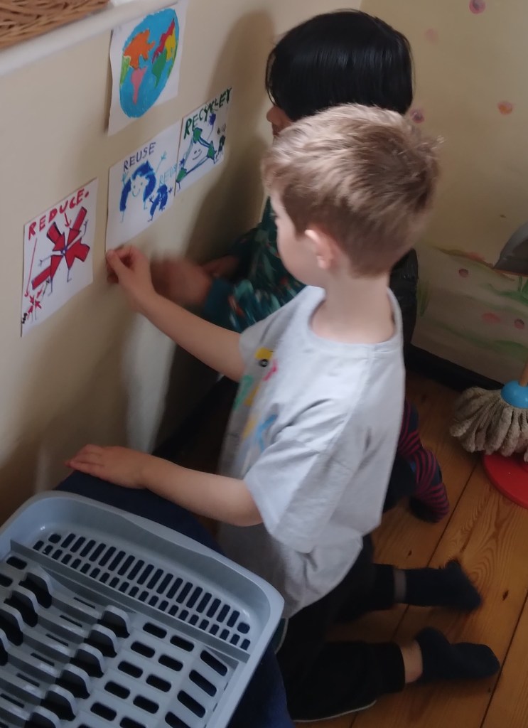 The children are involved in emptying the recycle baskets which we have placed along the general waste and food waste bins in the classroom. At the end of the day and always ask questions such as where do I put my yogurt pot? Can I recycle this?