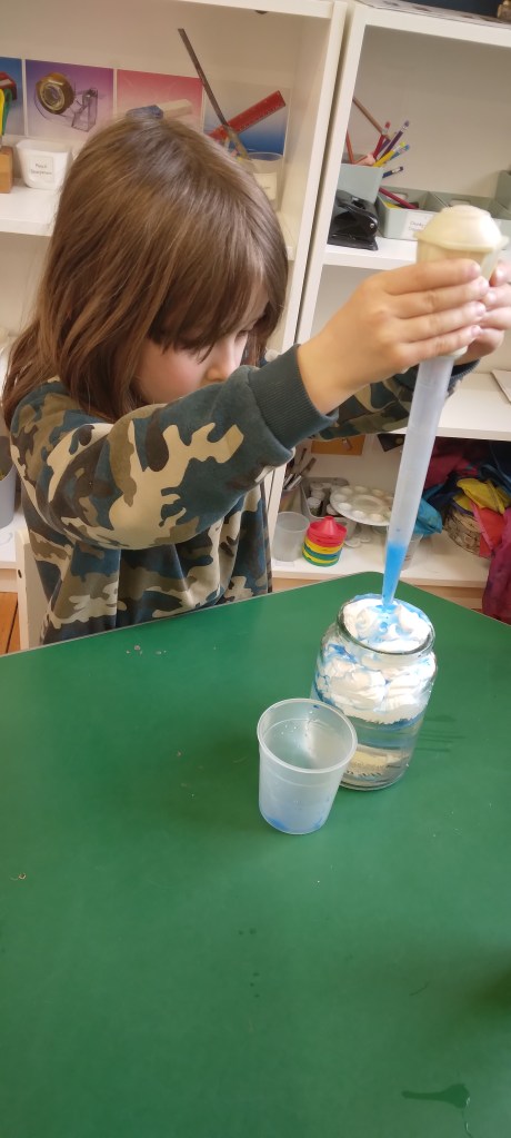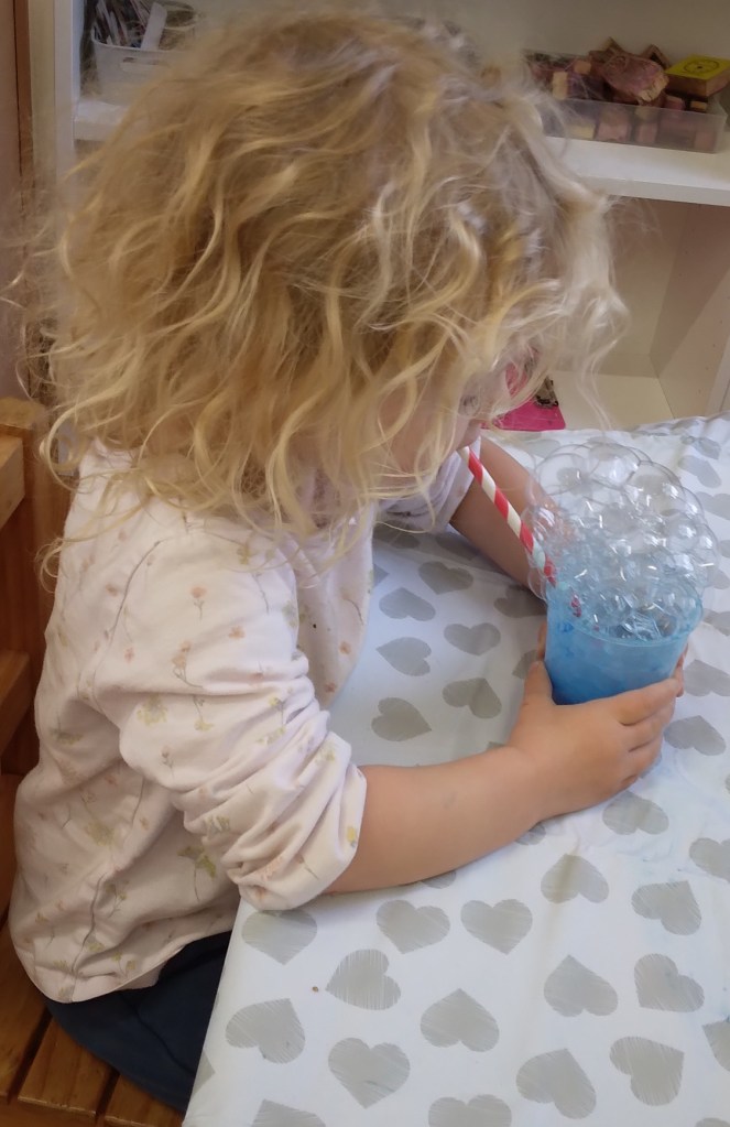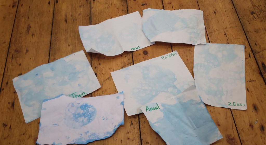 We have enjoyed blowing bubbles: light blue paint representing clean air and black paint representing dirty polluted air.
