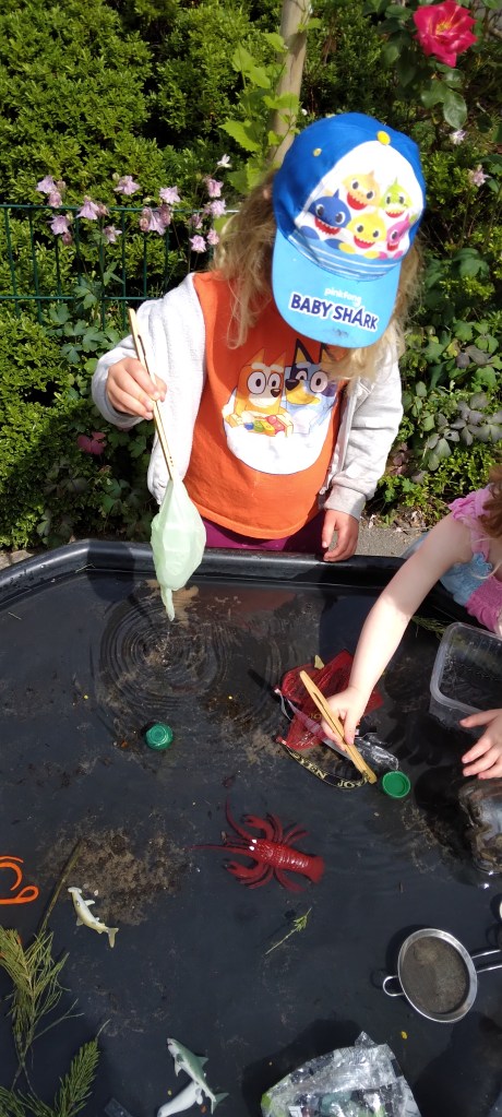 Setting up a tuff tray w/ rescuing the sea life animals from pollution. Using tongs encouraging physical development and coordination.